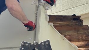 軒下ベニヤ板の「化粧はがれ」が目立ち見苦しい。中くらいの雨でも、樋が「オバーフロー」する。