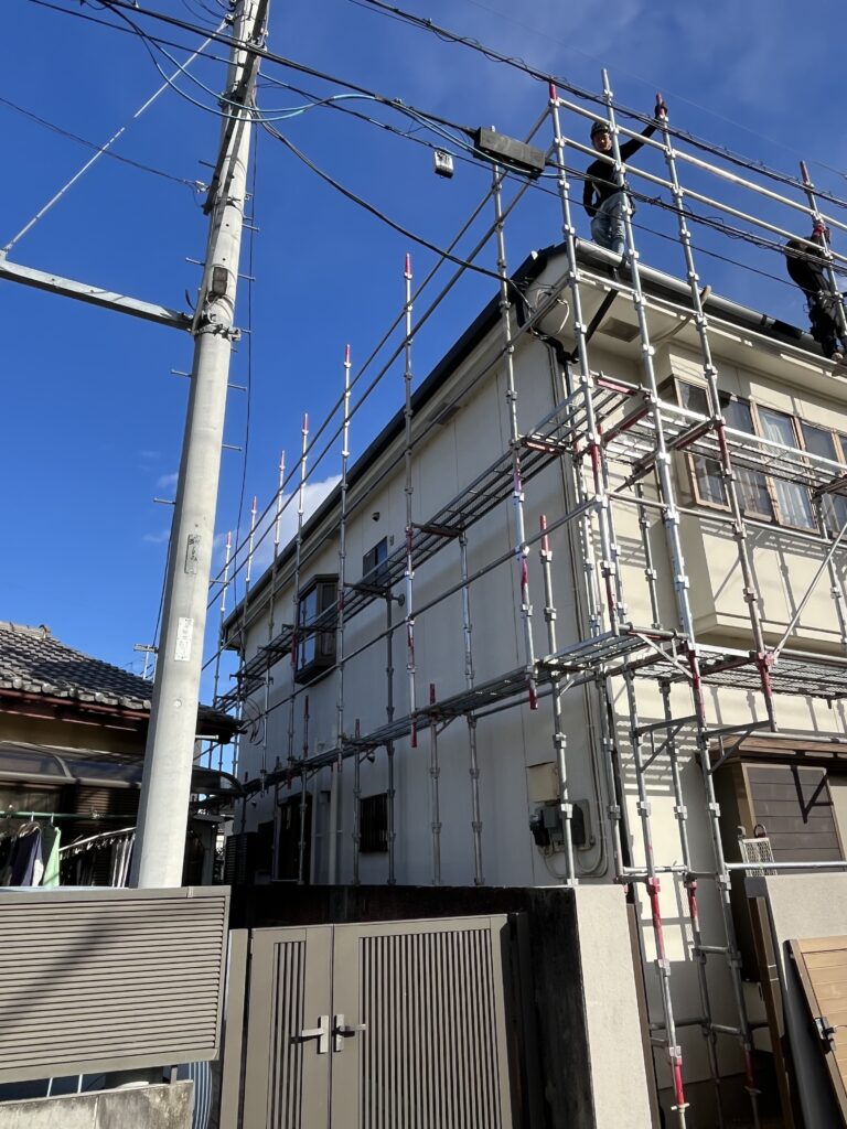 職人が安全に作業できる環境を整えるため、建物全体を囲うように足場を組み立てています。