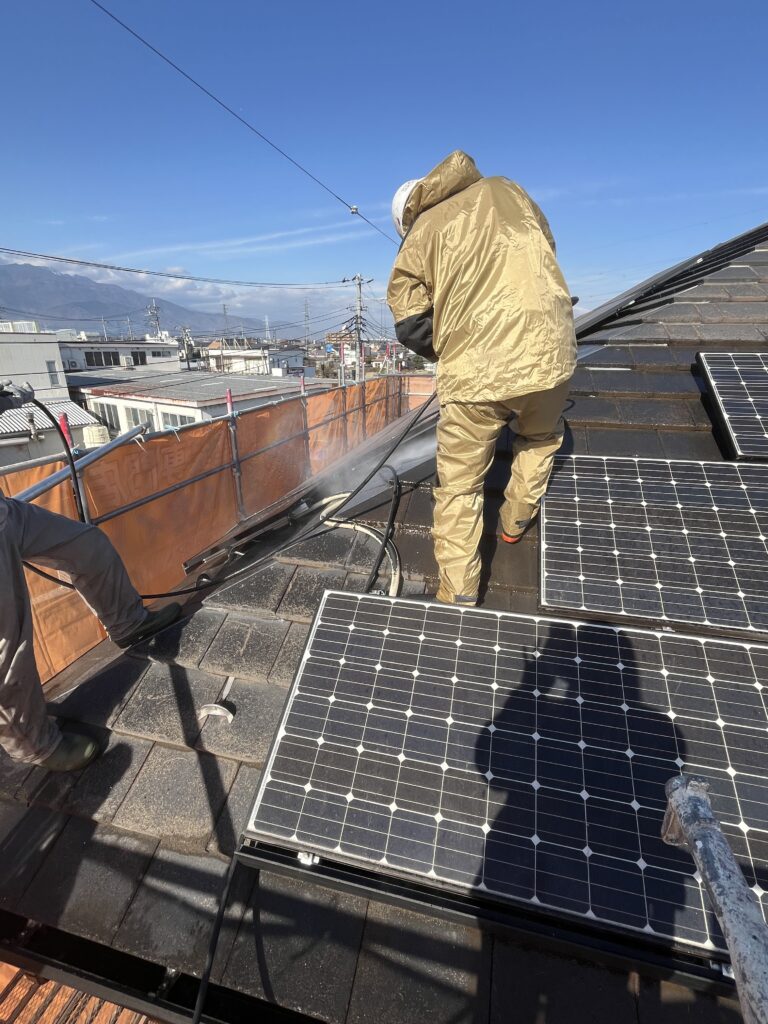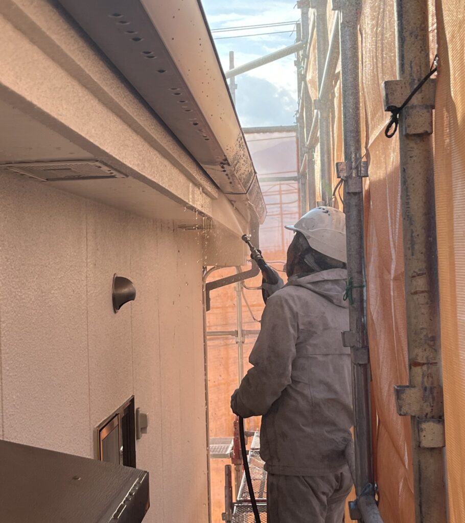 外壁や屋根に長年付着した汚れ、カビ、コケ、ホコリなどを高圧の水で丁寧に洗い流しています🚿