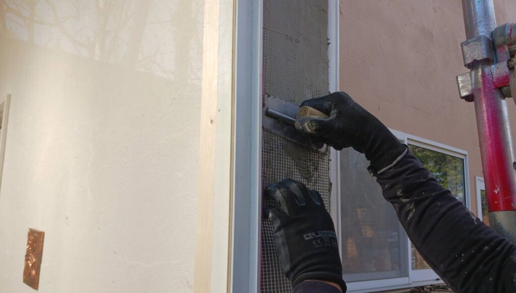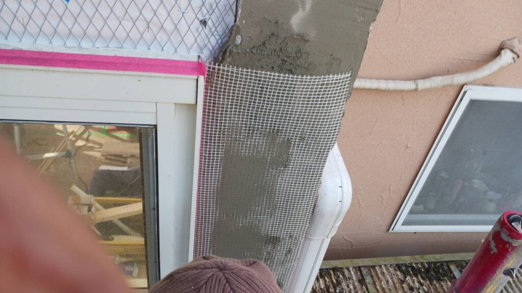 モルタル→メッシュシート→モルタルの順に施工しメッシュシートを埋め込みます。