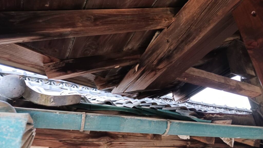 雨漏りの原因となっていた破損瓦とルーフィングシートを撤去し、野地板補修(増し張り工法)を行いました。