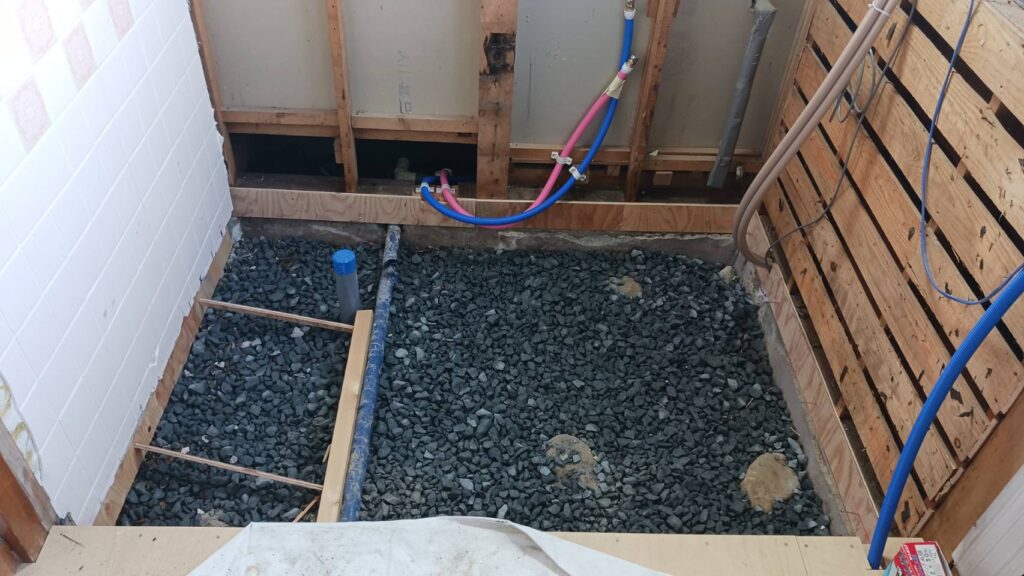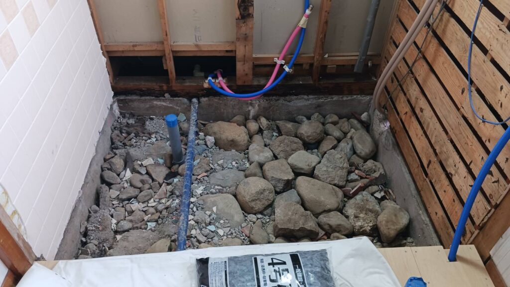 ユニットバス設置前に、土間コンクリート打設の下準備として採石を敷き込みます。