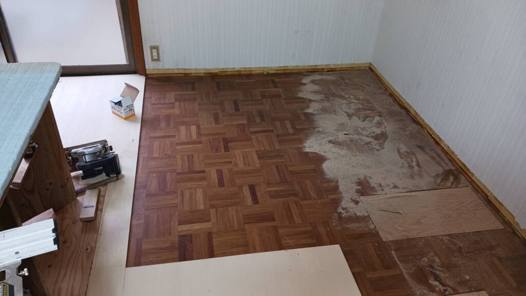 A様邸は既存の床板がシングル張りでしたので経年劣化が進みやすく、床下からの湿気の影響もあり、歩くと床がペコペコ沈む状態になっていました。