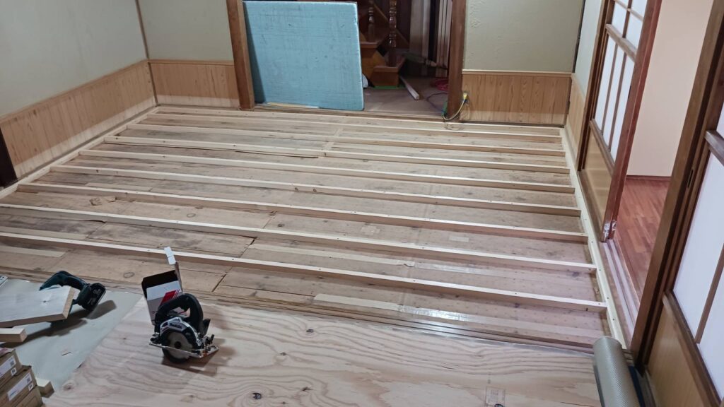加工した根太は、木工用ボンドとビスでしっかりと固定していきます💫