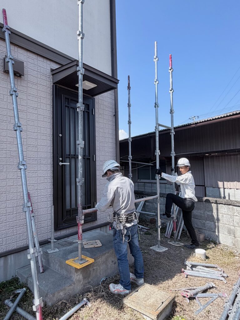 本日は外壁塗装工事の最初の工程となる足場設置と洗浄作業を行いました。