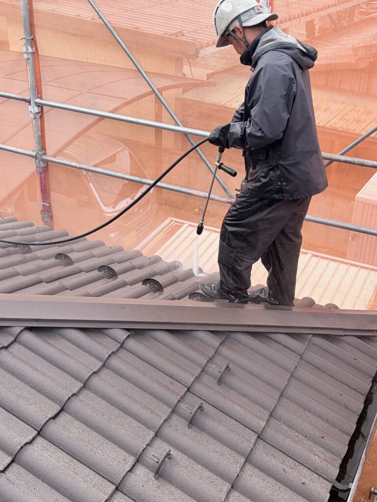 足場設置後は、外壁や屋根の高圧洗浄を行います。