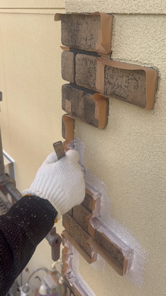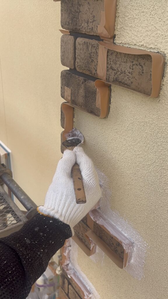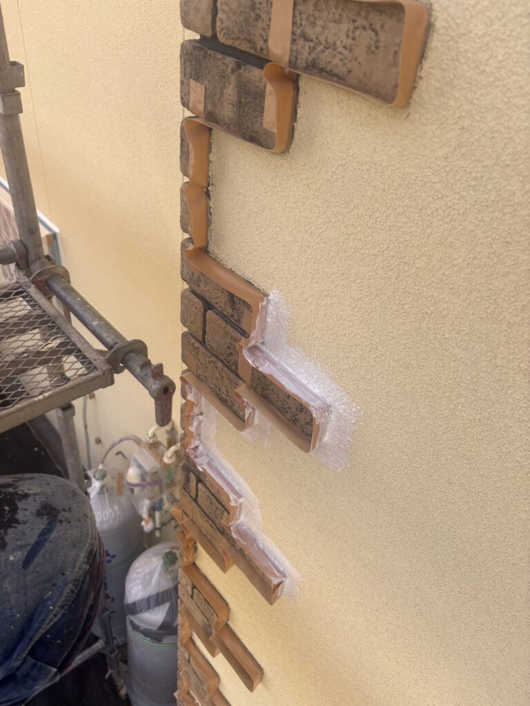 外壁の塗装に入る前に、とっても大切な作業があります。それは、レンガ調のブロックと外壁の「境目」の処理です。