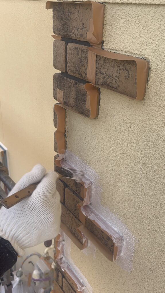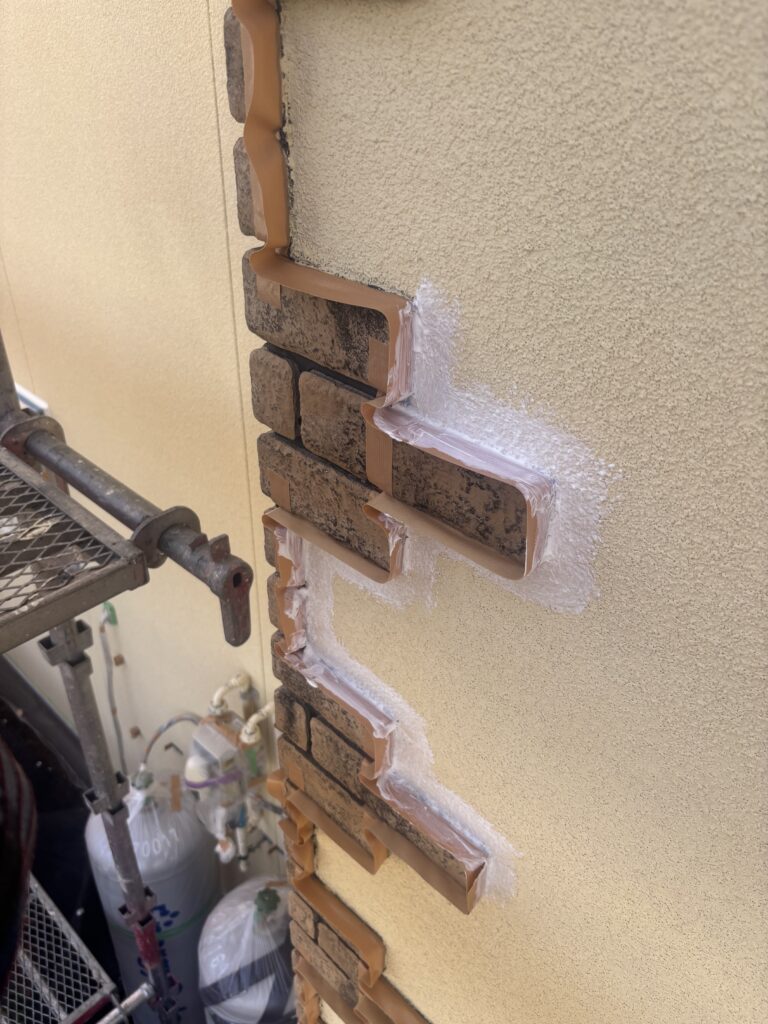 外壁の塗装に入る前に、とっても大切な作業があります。それは、レンガ調のブロックと外壁の「境目」の処理です。