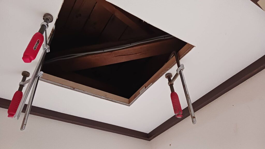 天井や壁を慎重にカットし、点検口の枠を設置します。