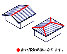棟とは、屋根面が交差する分水部分をさしていいます。屋根の山になっている部分の事です。