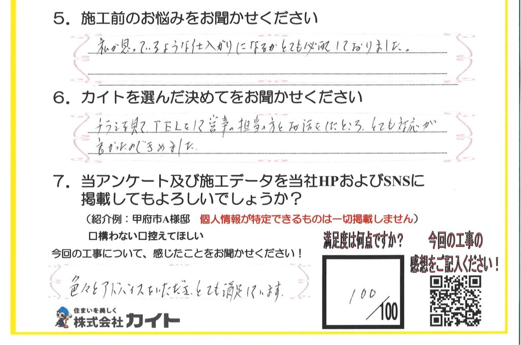 ホーム > 塗装のカイトのお客様の声 > 山梨県 甲斐市 S様邸🏠外壁塗装工事